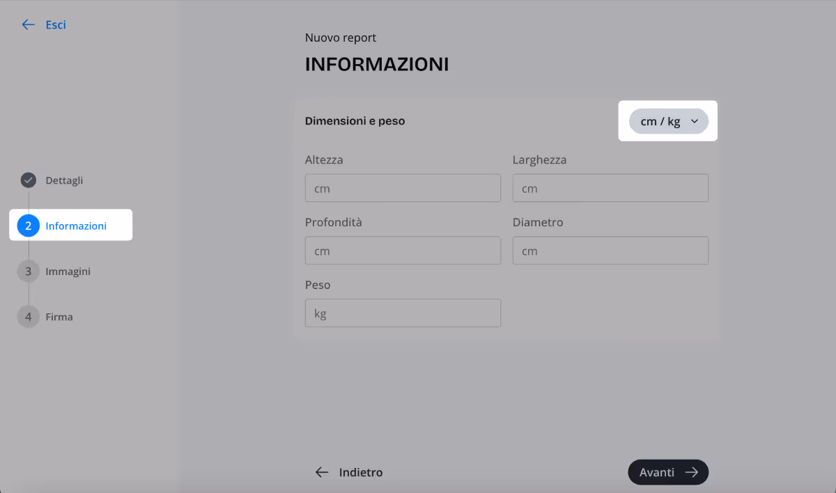 - Dimensioni e peso - alterna kg/cm ↔ in/lbs con l’interruttore.