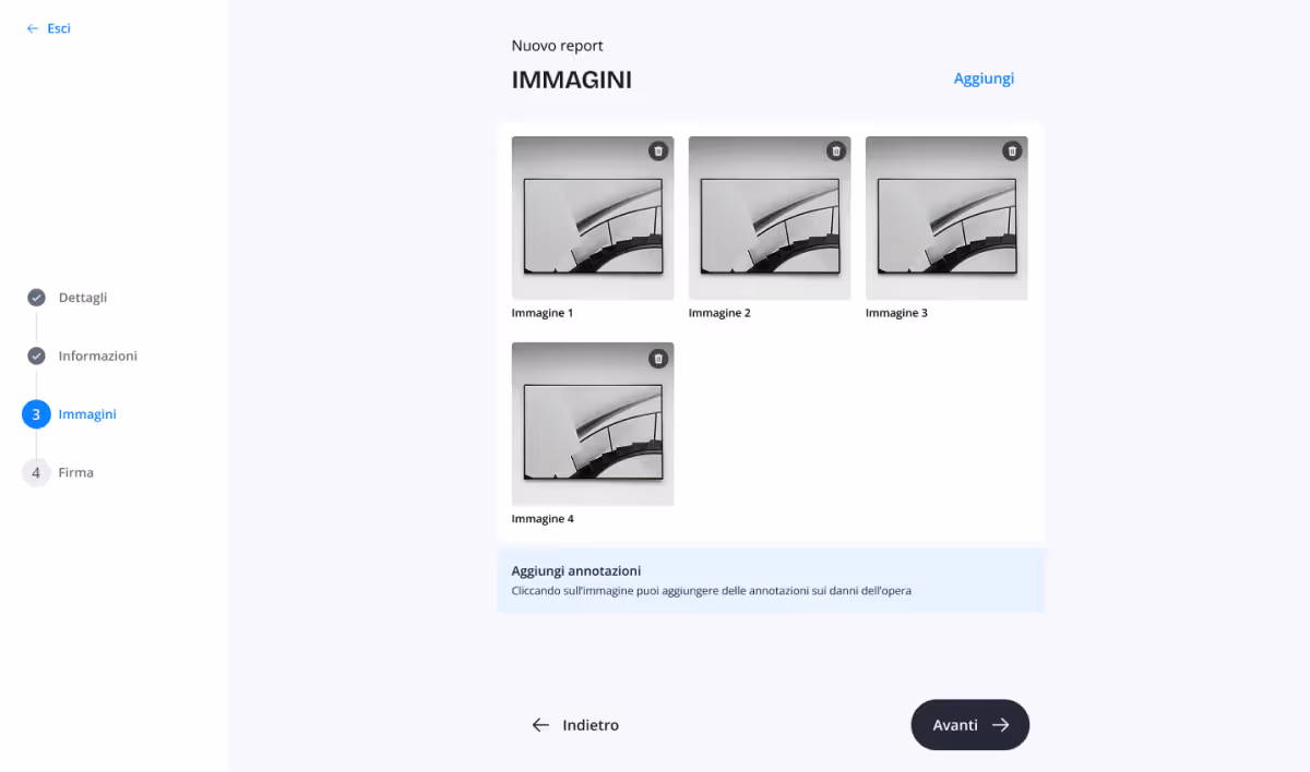 A questo punto puoi caricare immagini dal tuo dispositivo o scattarle direttamente se stai utilizzando un tablet o uno smartphone. Una volta inserite, le immagini possono essere rinominate, modificate, annotate oppure eliminate.