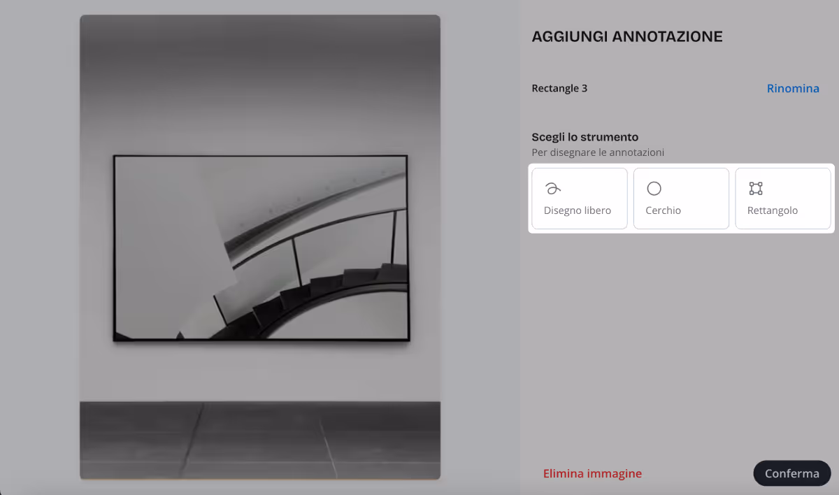 - Seleziona unʼimmagine e scegli lo strumento che vuoi usare per annotare: Disegno libero, Cerchio o Quadrato.