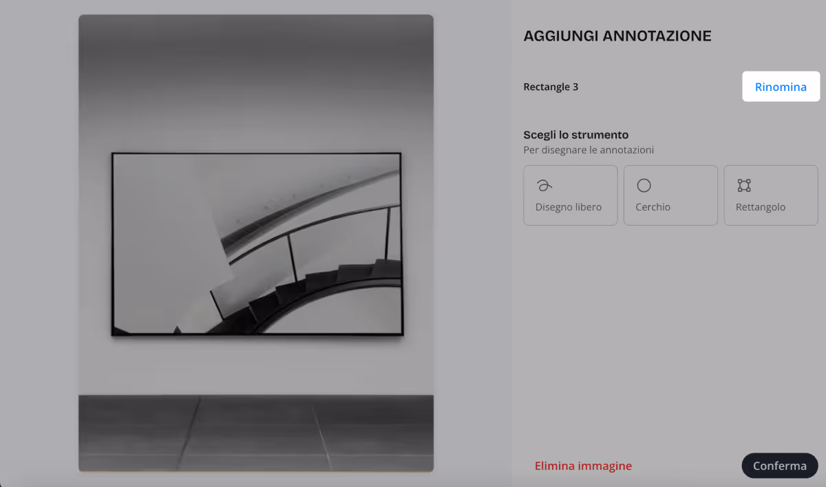 Ti consigliamo di dare un nome chiaro alle tue immagini così da poterle riconoscere più facilmente (Es. fronte, retro, focus…). Per fare ciò seleziona l’immagine, clicca Rinomina, inserisci il nuovo nome e Salva.