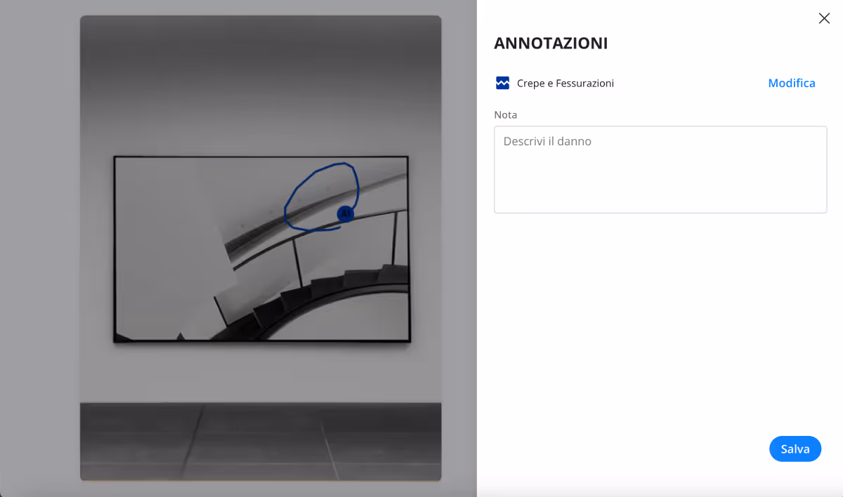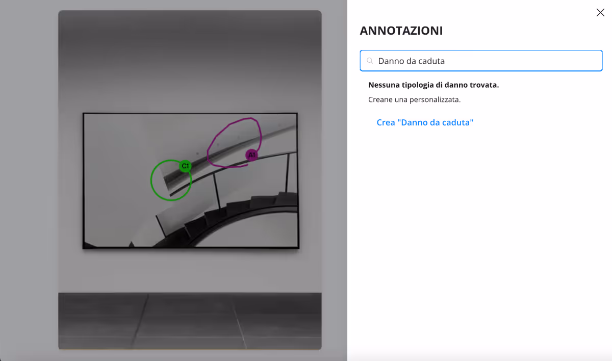 - Seleziona la tipologia di danno dall’elenco oppure usa la barra di ricerca per cercare più velocemente. Aggiungi note se necessario oppure clicca Modifica per tornare indietro e selezionare una tipologia diversa. Le annotazioni sono numerate automaticamente (A1, B1…Z1, A2…).