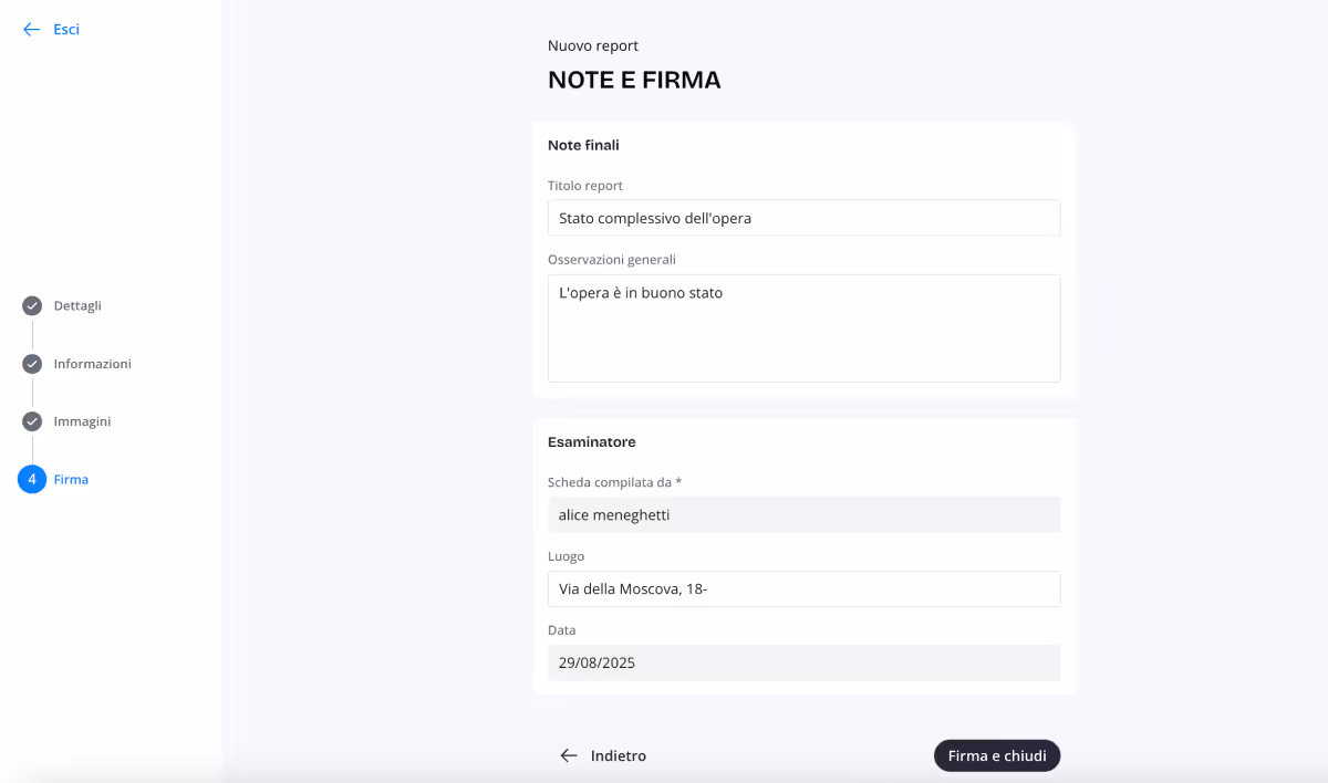 Infine, associa al tuo report un titolo e, se necessario, inserisci osservazioni generali sullo stato dell’opera. Il nome dell’esaminatore e la data di creazione vengono registrati automaticamente, puoi aggiungere il luogo in cui è stato redatto il report.